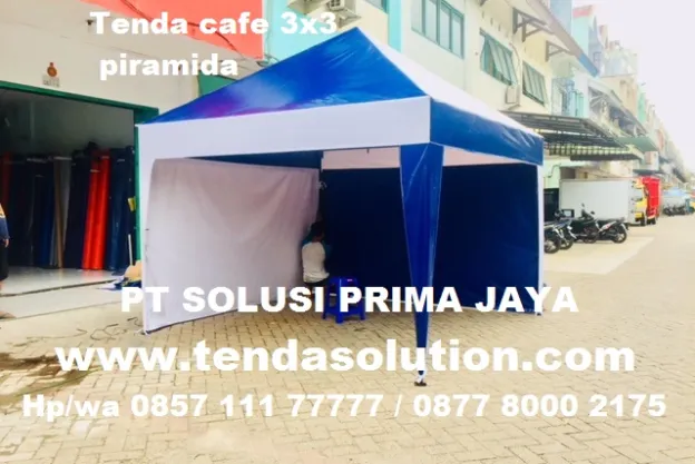 Tenda Cafe Piramida merupakan jenis tenda yang paling banyak dipakai dalam penggunaan yang berhubungan dengan stand-stand penjualan makanan dan minuman, maupun stand-stand dealer kendaraan bermotor, Namun jenis tenda ini juga sering digunakan untuk berbagai kegiatan promosi atau branding produk yang biasanya dilakukan di ruang terbuka / outdoor. Dengan bentuk atapnya yang berbentuk piramida dan dengan speck rangka besi 1inci s/d 2inci, didesign dengan ukuran adalah 2mx2m, 2mx3m, 3mx3m, 3mx4m, 4mx4m, 5mx5m, maka desain tenda ini sangat dapat disesuaikan dengan keinginan pelanggan dan jenis bahan terpalnya pun bervariasi sehingga bisa menampilkan desain tenda yang unik dan menarik serta dapat disablon / diprinting dengan merk logo perusahaaan anda. Bahan untuk tenda cafe piramida ini adalah terpaulin 410 GSM atau 440 GSM, dan bentuk tenda ini dapat juga ditambahkan dengan dinding terpal ataupun tanpa dinding terpal, sesuai keinginan konsumen.Tenda piramida ini dapat juga direques / custom dengan ukuran 6m x 6m dengan 4 tiang kaki, serta speck rangka besi yang disesuaikan dengan tingkat keamanannya.